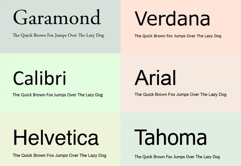 • Verdana: Font dễ đọc trên màn hình, với khoảng cách ký tự rộng, phù hợp cho các ứng dụng web và tài liệu hiển thị trên thiết bị điện tử.